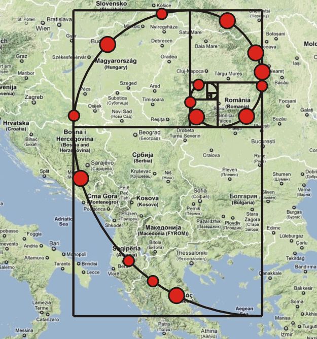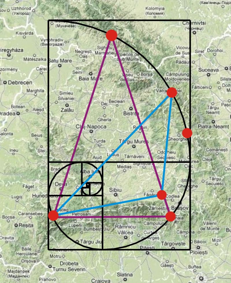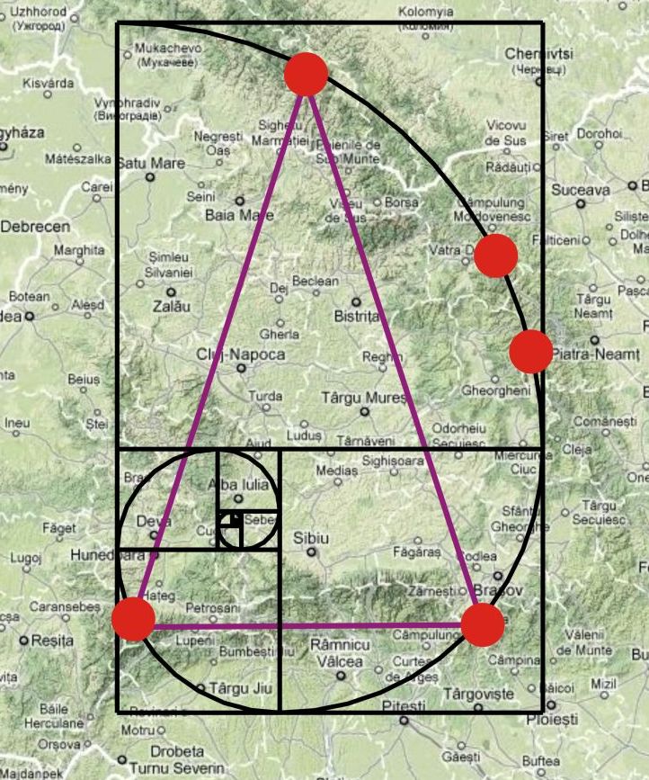 În figura de mai jos sunt delimitate două triunghiuri isoscele Fibonacci, unul cu două unghiuri de 720 şi altul cu două unghiuri de 360. Primul este format de punctele Retezat-Bucegi-Punctul Nord din Ucraina (triunghiul violet), iar al doilea este format din punctele Retezat – Şinca Veche – Rarău (triunghiul albastru).