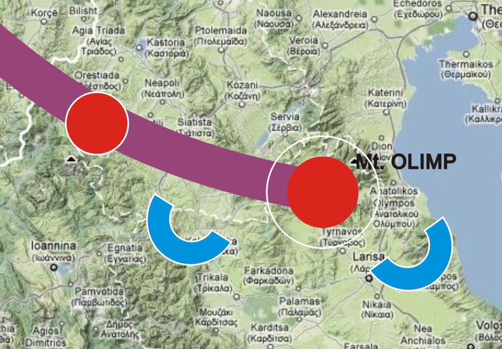 Banda de energie sacră este are două puncte de „ghidaj”: unul este în zona formaţiunilor stâncoase de lângă oraşul Kalambaka (cunoascută ca şi aşezarea monastică Meteora), şi altul undeva în zona Muntelui Ossa. Este foarte posibil să mai fie unul în zona Halkidiki (poate Athos) În momentul de faţă, aceste două zone sunt cunoscute ca fiind primele centre ale spiritualităţii creştine ortodoxe.